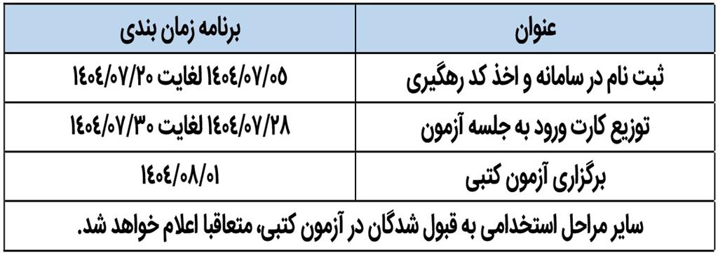 4. انجام خدمت نظام وظیفه عمومی و یا معافیت دائم. تاریخ پایان خدمت وظیفه و یا صدور کارت معافیت دائم می بایست حداکثر تا روز آزمون کتبی (قبل از تاریخ 01/08/1404) باشد.