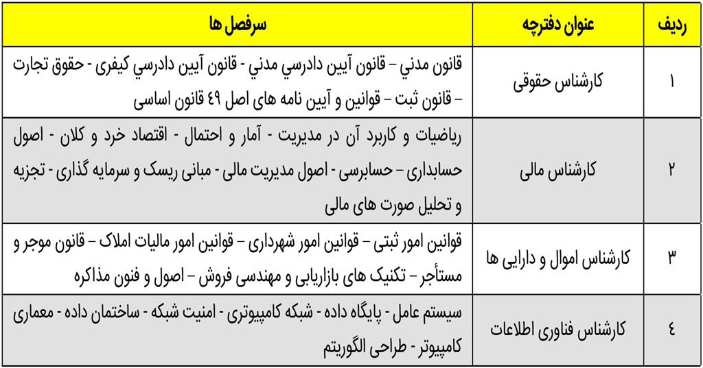 سؤالات آزمون شامل دو دفترچه عمومی و تخصصی شامل 60 سؤال عمومی و 50 سؤال تخصصی می باشد.